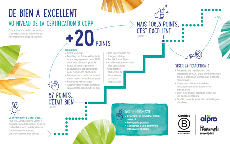En 2018, grâce à une stratégie d’innovation poussée et à des efforts constants, Alpro a été couronné pour la première fois avec un certificat B Corp. Aujourd’hui, trois ans plus tard, Alpro reconfirme son certificat B Corp et augmente son score, grâce aux progrès réalisés dans sa stratégie de développement durable, pour atteindre 106,3 points.