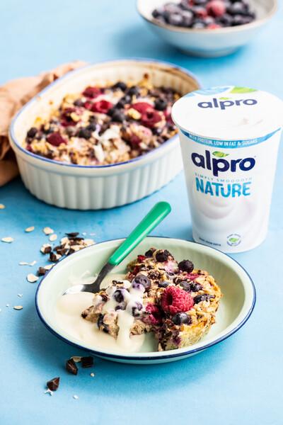Recouvrez un plat de 15 x 22 cm de papier sulfurisé. Répartissez-y le mélange Alpro, ajoutez des cuillères de beurre de cacahuète supplémentaire, puis dispersez les framboises, le granola et la menthe sur le dessus.