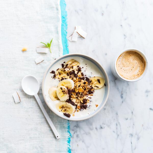 Dans un mixeur, mixer tous les ingrédients à l'exception des noix, des dattes et de l’alternative au yogourt Alpro nature sans sucres. Hacher grossièrement les noix et couper les dattes en quatre.
