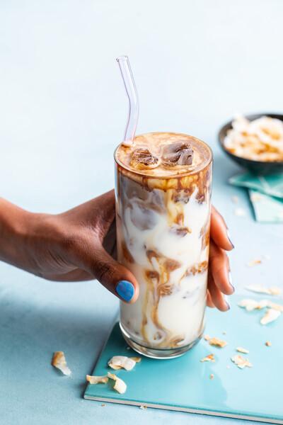 Faire mousser l’Alpro Barista avoine, le sirop de fraise & la poudre de betterave, et verser dans un verre.