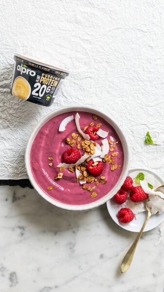 Přilijte proteinový nápoj nebo neslazený ovesný nápoj Alpro.