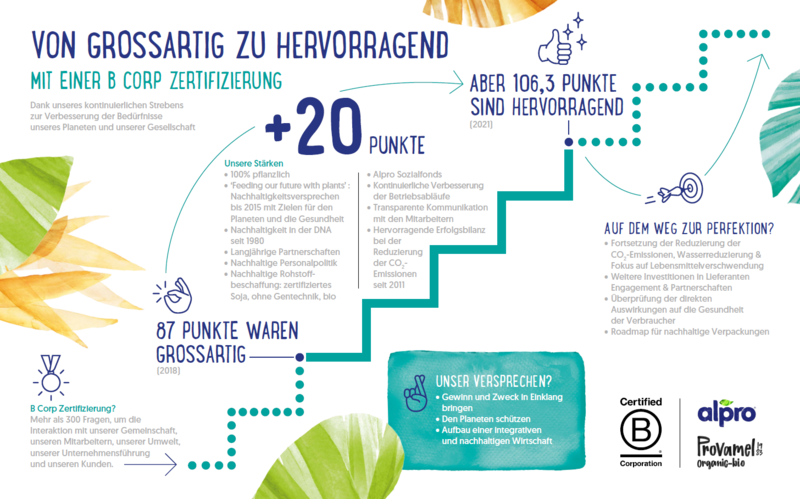 Dank einer ausführlichen Innovationsstrategie und permanenter Anstrengungen wurde Alpro im Jahr 2018 zum ersten Mal mit einem B Corp-Zertifikat ausgezeichnet. Heute – drei Jahre später – konnte Alpro sein B Corp-Zertifikat bestätigen und sein Ergebnis sogar noch verbessern: Durch eine konsequent fortschrittliche Nachhaltigkeitsstrategie erzielte Alpro mit 106,3 Punkten eine „hervorragende" Leistung. Damit gehört Alpro zu den weltweit besten 13% der im Bereich „Food & Beverages“ zertifizierten B Corps und ist in diesem Bereich Nr. 1 in Deutschland, Österreich und der Schweiz.