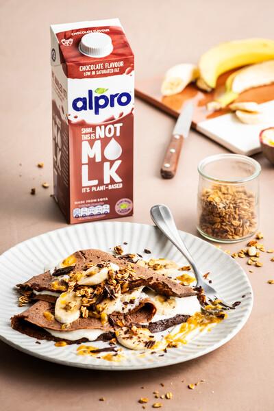 Banane in einer großen Schüssel zerdrücken und Alpro Mandeldrink, Vanilleextrakt und Sonnenblumenöl mit einem Schneebesen einrühren, bis die Masse glatt und cremig ist.