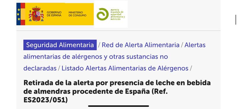 Hoy las Autoridades Sanitarias, con un nuevo informe técnico que anula y sustituye al anterior, ha comunicado oficialmente la retirada de la alerta y constata que el producto cumple con la normativa, es 100% vegetal y totalmente segura para el consumo de personas intolerantes o alérgicas a la leche de vaca.