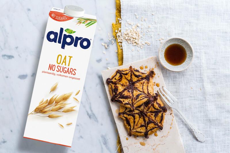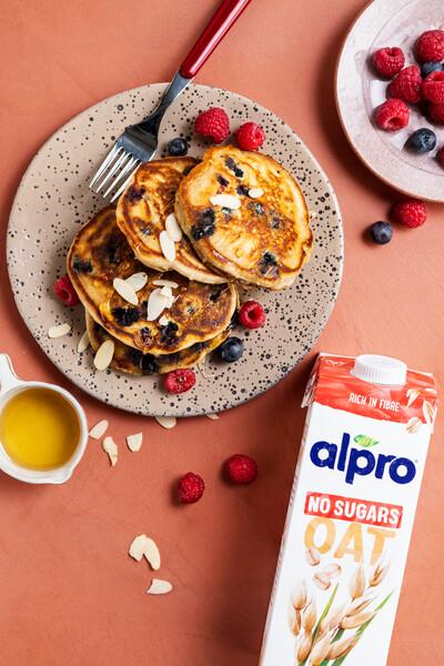 Mix in een blender de Alpro Sojadrink, haver- en rijstmeel, bakpoeder, maïzena, gemengde zaden, bananen en water tot een romig pannenkoekenbeslag.