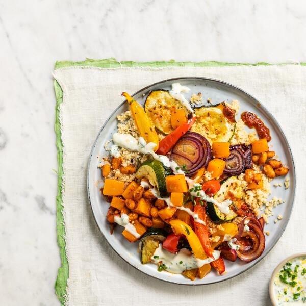 To serve, add rocket to your plate before topping with the cous-cous salad and harissa cauliflower. Drizzle with the tahini dressing and garnish with parsley and optional seeds / nuts, if you wish.